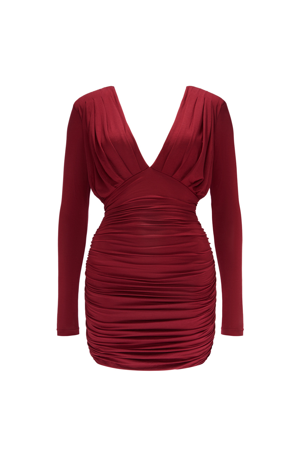 Blair Bordeaux embodies elegance and modern glamour. Made from high-quality knit fabric, it provides a perfect fit while ensuring comfort. The deep neckline and ruching along the entire length add feminine charm, subtly highlighting the waistline. Long sleeves and a short length create a refined balance, making this dress perfect for both evening outings and more formal occasions. It's an essential piece in the wardrobe of any woman who values classic elegance with a touch of boldness.