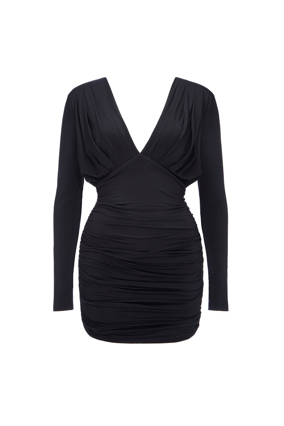 Blair Noir is the epitome of elegance and modern glamour. Made from high-quality knit fabric, it provides a perfect fit while ensuring wearing comfort. The deep neckline and ruching along the entire length give it a feminine charm, subtly accentuating the waistline. Long sleeves and a short cut create a refined balance, making the dress perfect for both evening outings and more formal occasions. It's an indispensable piece in every woman’s wardrobe who values classic elegance with a hint of boldness. The product has shoulder pads.
