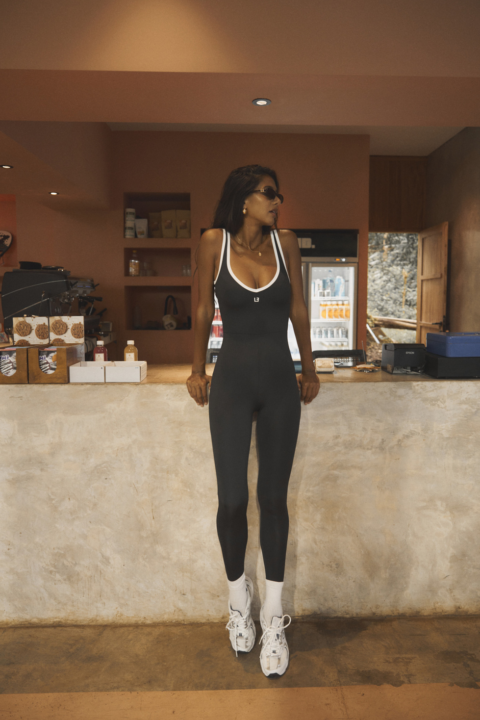 The Black Le Sport Jumpsuit with white details, made from stretchy fabric, fits the body perfectly, accentuating its assets. The jumpsuit features a deep U-shaped neckline, subtly adorned with white piping, adding a classic contrast that draws attention. The minimalist design is enhanced by a small, stylish logo on the front, highlighting the brand with attention to detail. This versatile jumpsuit is perfect for both everyday wear and evening outings, offering style and comfort in one.
