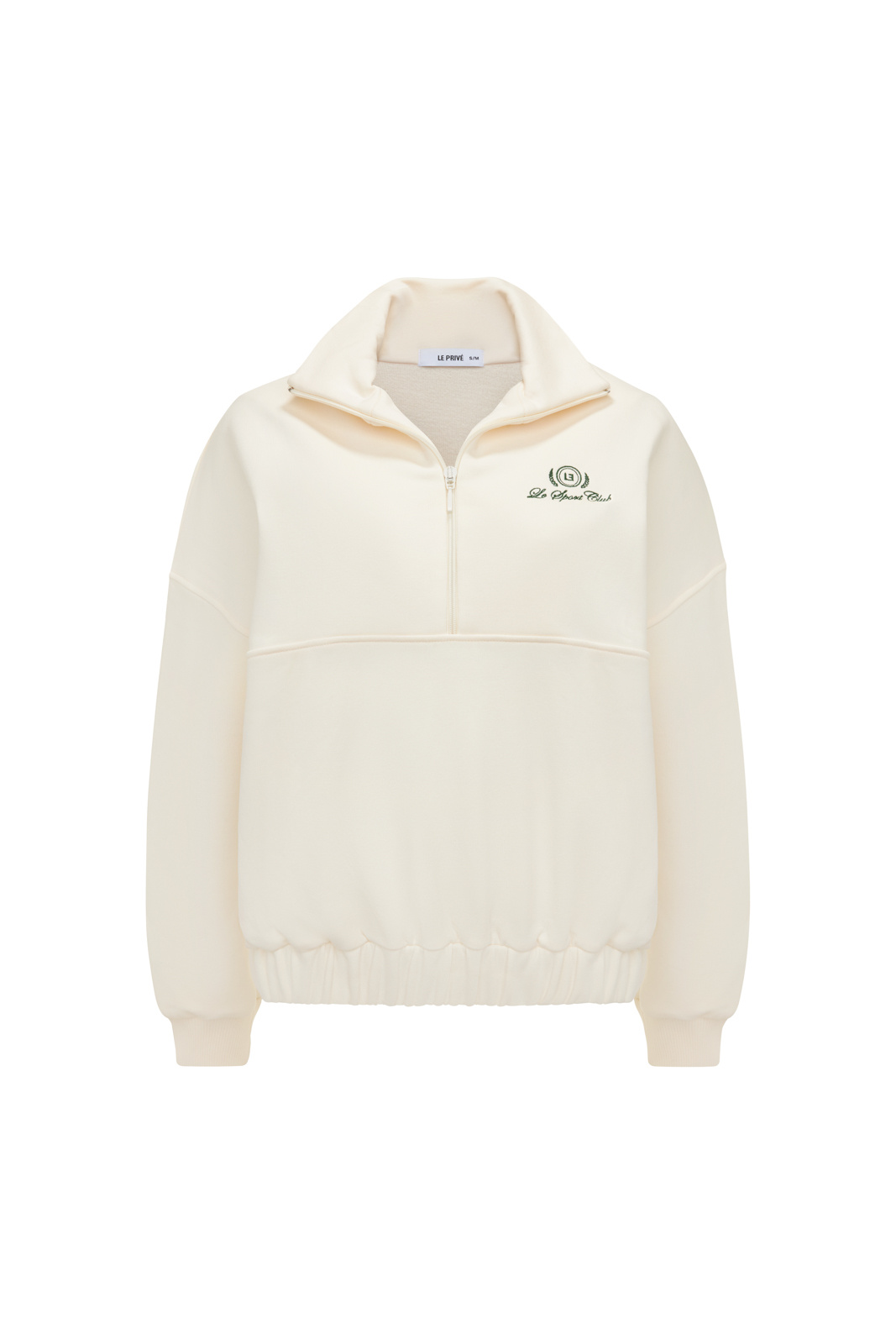 Venus Zip Cream, in an oversized fit, is the essence of sporty chic and comfort. Crafted from soft, premium fabric, it offers all-day ease of wear. The cream color and subtle "Le Sport Club" logo give it a minimalist yet stylish character. A half-zip turtleneck adds a modern touch, while the loose oversized cut provides freedom of movement and aligns perfectly with current trends. Ideal for both training and everyday casual styling, it creates an effortlessly fashionable look.