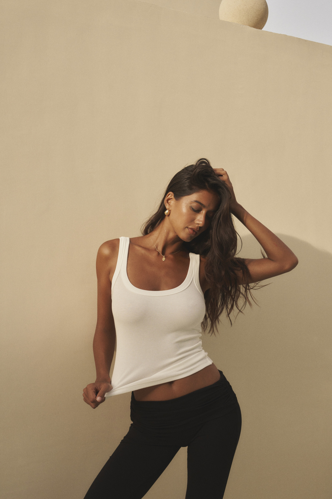 Everyday Tank Top es un top de tirantes atemporal que combina un estilo minimalista con la máxima comodidad. Confeccionado en un tejido suave y acanalado, se adapta perfectamente al cuerpo, resaltando su forma natural. El clásico escote redondeado añade un toque de elegancia sutil, mientras que el corte sencillo lo convierte en una prenda versátil imprescindible en cualquier armario. Es ideal tanto para looks deportivos y casuales como para combinaciones más sofisticadas con accesorios elegantes, logrando un estilo relajado pero refinado. Una opción perfecta para los días cálidos o como base bajo blazers y suéteres.