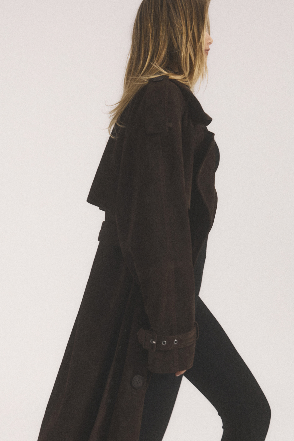Iconic Suit Trench Coat to kwintesencja ponadczasowej elegancji w ekskluzywnym wydaniu. Wykonany z najwyższej jakości, miękkiej skóry zamszowej, wyróżnia się luksusowym wyglądem i wyjątkowym komfortem noszenia. Jego perfekcyjnie skrojony fason podkreśla sylwetkę, a wbudowane poduszki na ramionach dodają mu wyrazistej struktury i podkreślają mocny, nowoczesny charakter. Dopracowane detale, takie jak szerokie klapy, regulowane paski na mankietach oraz masywne guziki, nadają całości ekskluzywnego wyrazu. Pasek w talii pozwala na dopasowanie płaszcza do sylwetki, podkreślając jej proporcje. Długi, elegancki krój sprawia, że jest to idealny wybór zarówno do stylizacji casualowych, jak i tych bardziej wyrafinowanych. To ponadczasowy element garderoby, który łączy w sobie luksus, minimalizm i niepowtarzalny charakter. Świetnie komponuje się zarówno z klasycznymi kozakami, jak i nowoczesnymi szpilkami, tworząc niebanalny, szykowny look.