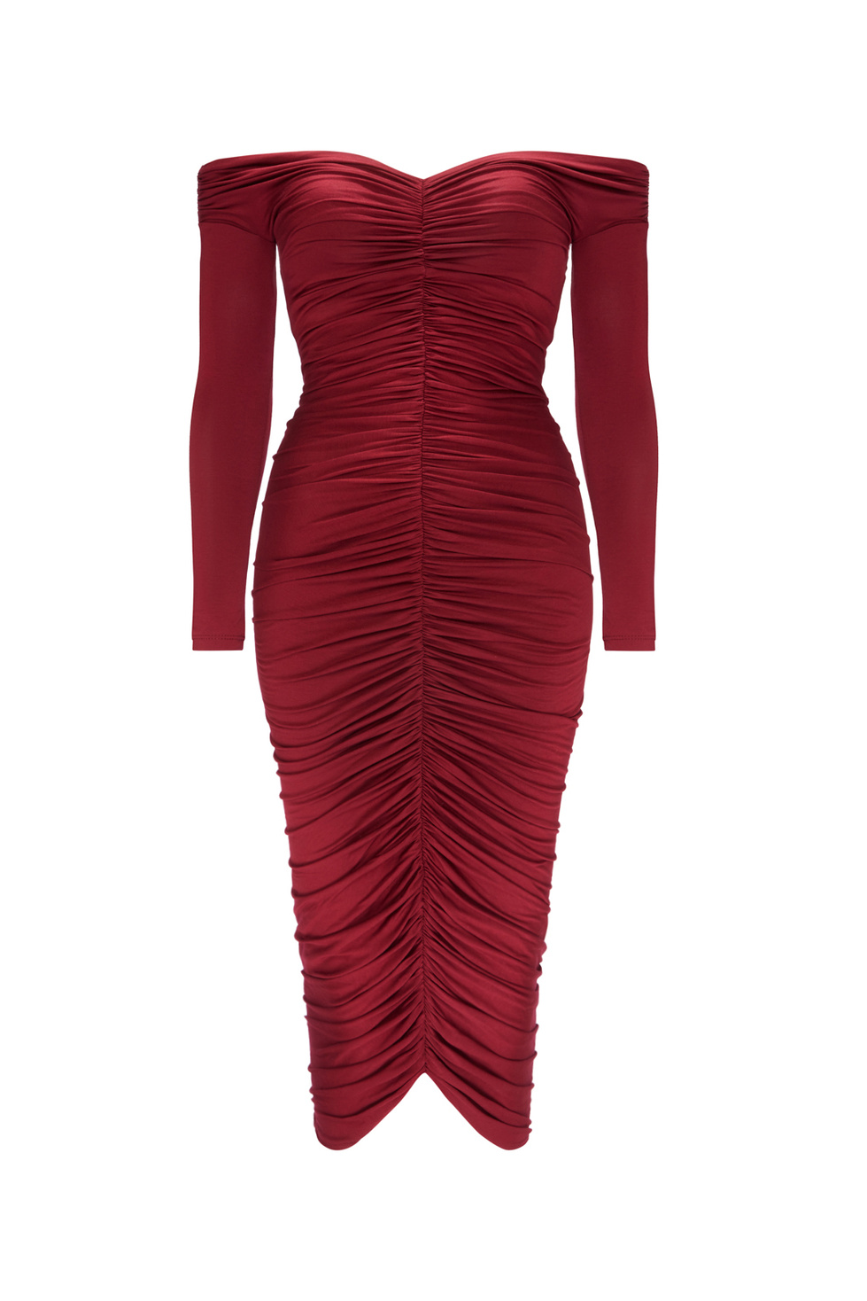 Nastya Bordeaux to wyjątkowa sukienka, która łączy elegancję z nutą zmysłowości. Uszyta z wysokiej jakości dzianiny, idealnie przylega do ciała, podkreślając kobiecą sylwetkę i gwarantując wygodę noszenia. Głęboki, hiszpański dekolt odsłania ramiona, dodając kreacji subtelnego uroku, a marszczenia na całej długości podkreślają talię i dodają jej wyjątkowego charakteru. Długie rękawy i dopasowany krój sprawiają, że sukienka ta sprawdzi się idealnie zarówno na wieczorne wyjścia, jak i bardziej formalne okazje. Nastya Bordeaux to niezastąpiony element w szafie każdej kobiety, która ceni ponadczasową klasykę z nutą nowoczesności.